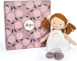 Schattige pop Nina is de ideale metgezel voor ieder kind. Ze draagt gestreepte maillots en elegante witte jurkjes met grijze ballerina's. Haar bruine haar is stijlvol in staartjes met pompons gestyled, wat haar een onweerstaanbare uitstraling geeft.