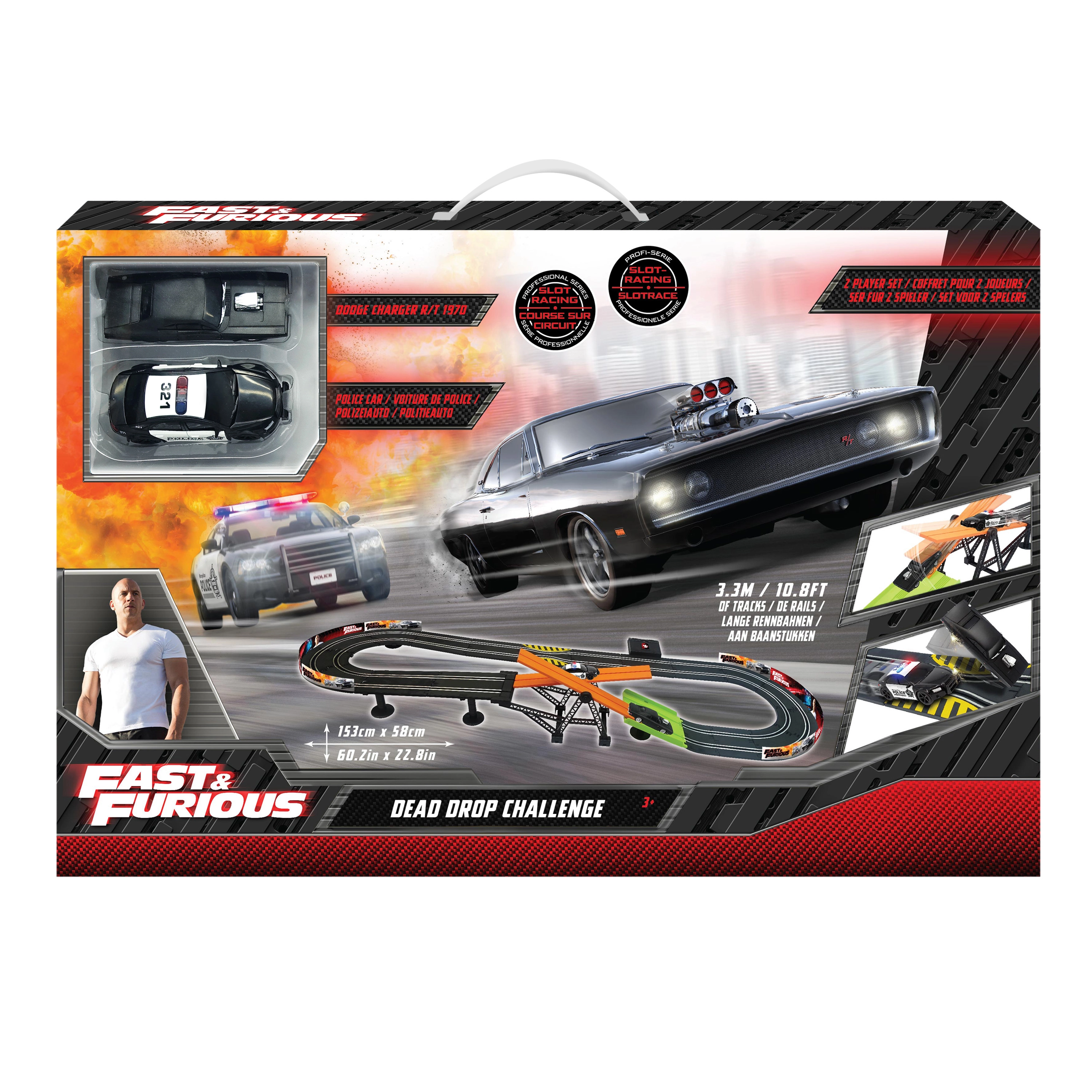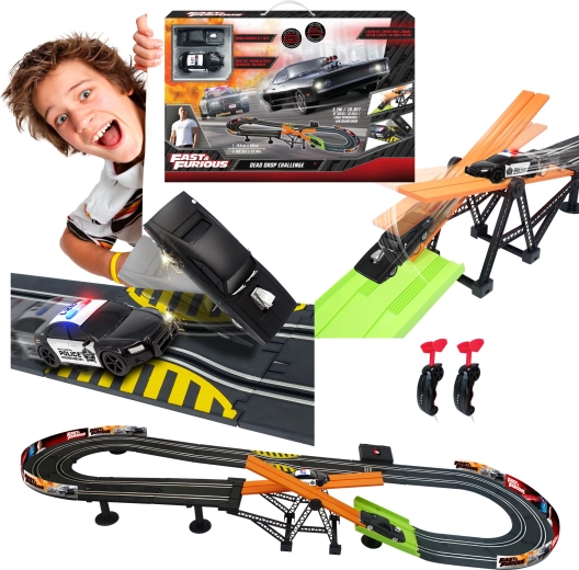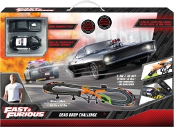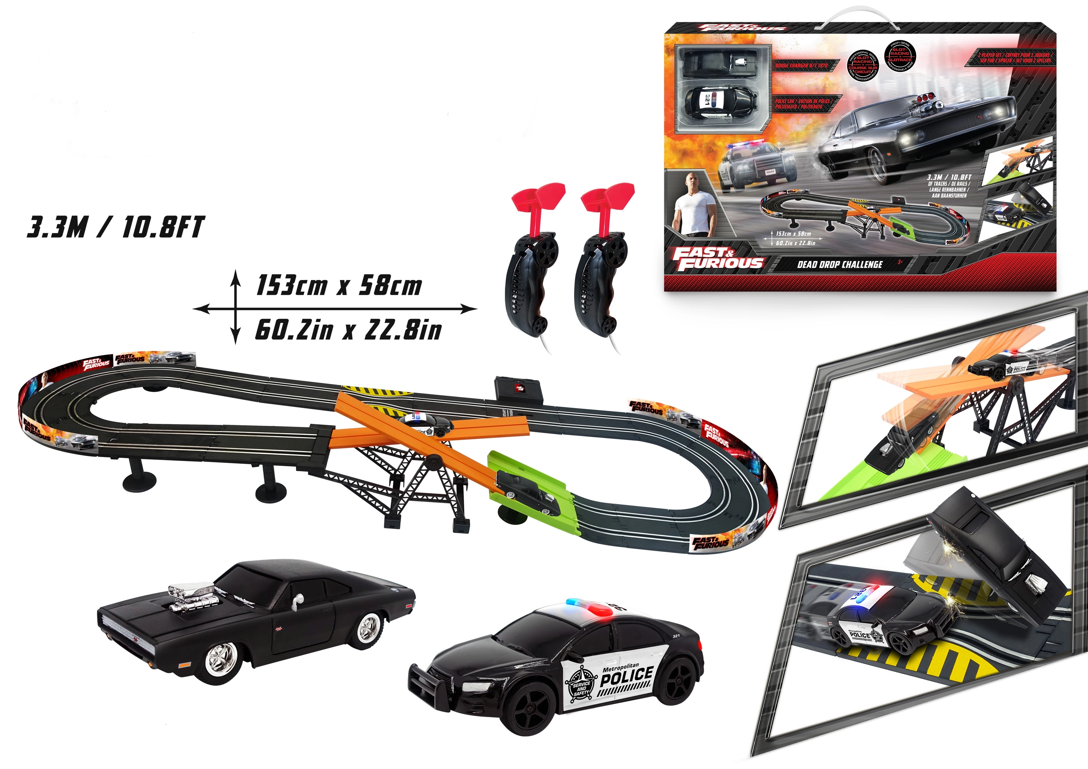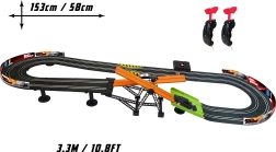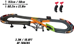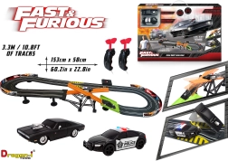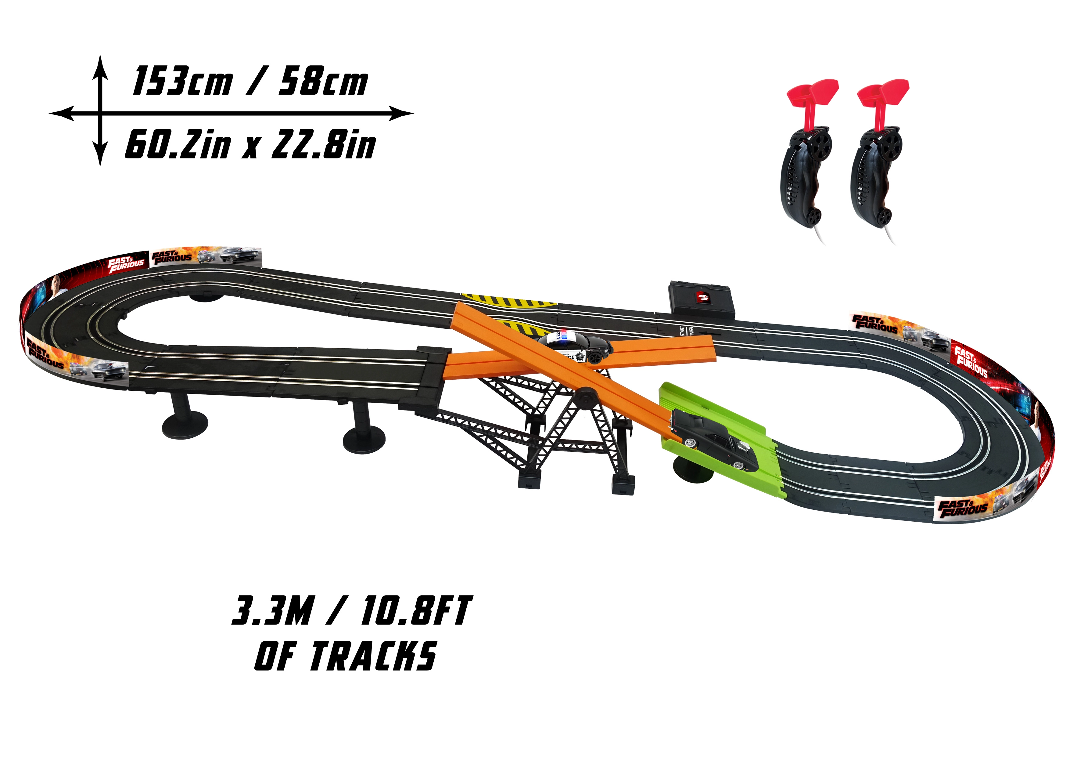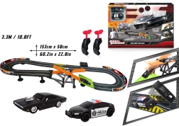 Autobaan met obstakel Fast & Furious. Baans lengte 3,3 m. Afmetingen 153×58 cm. 2 auto’s inbegrepen. 6x AA-batterijen voor het batterijvak niet inbegrepen. Montagehandleiding inbegrepen.