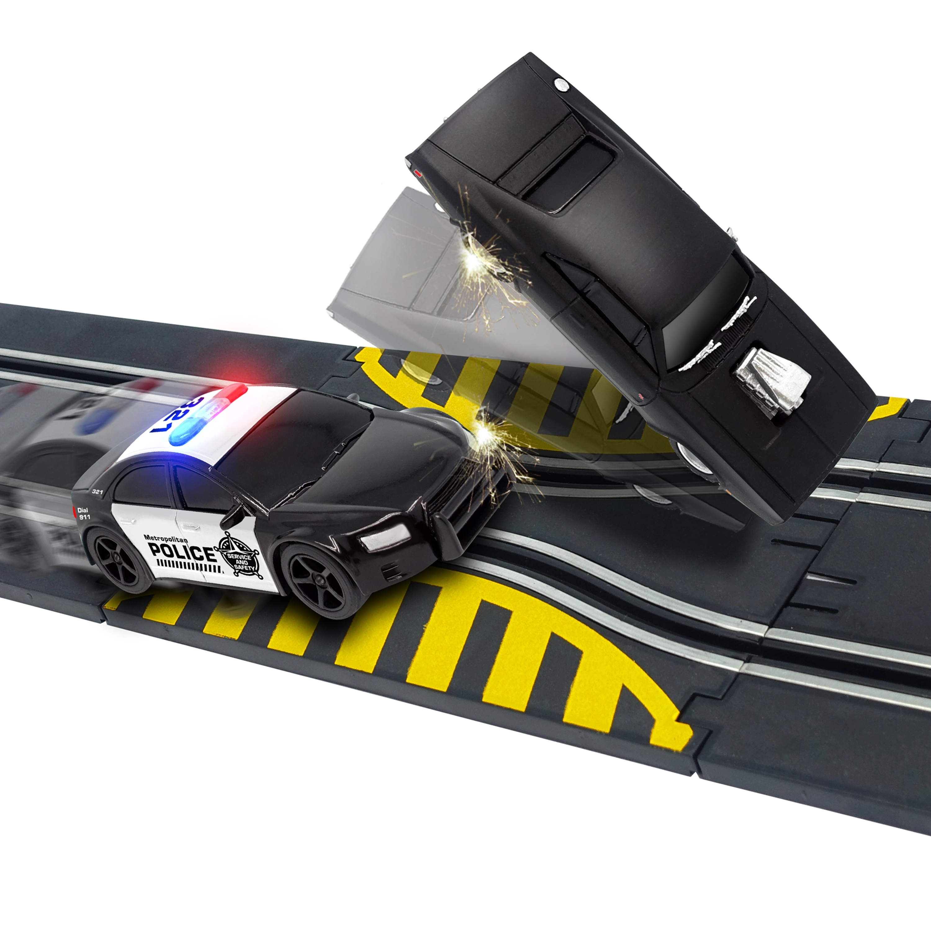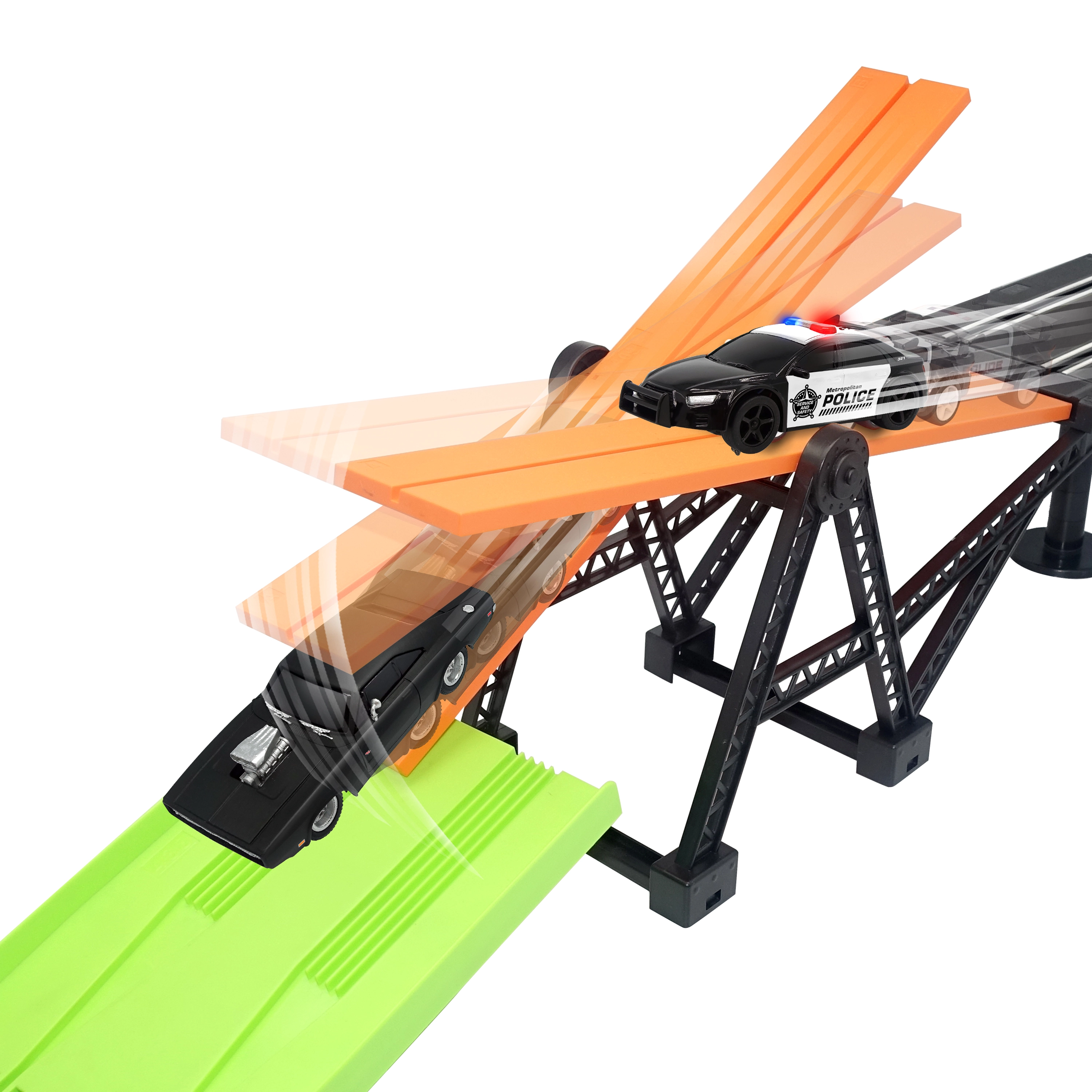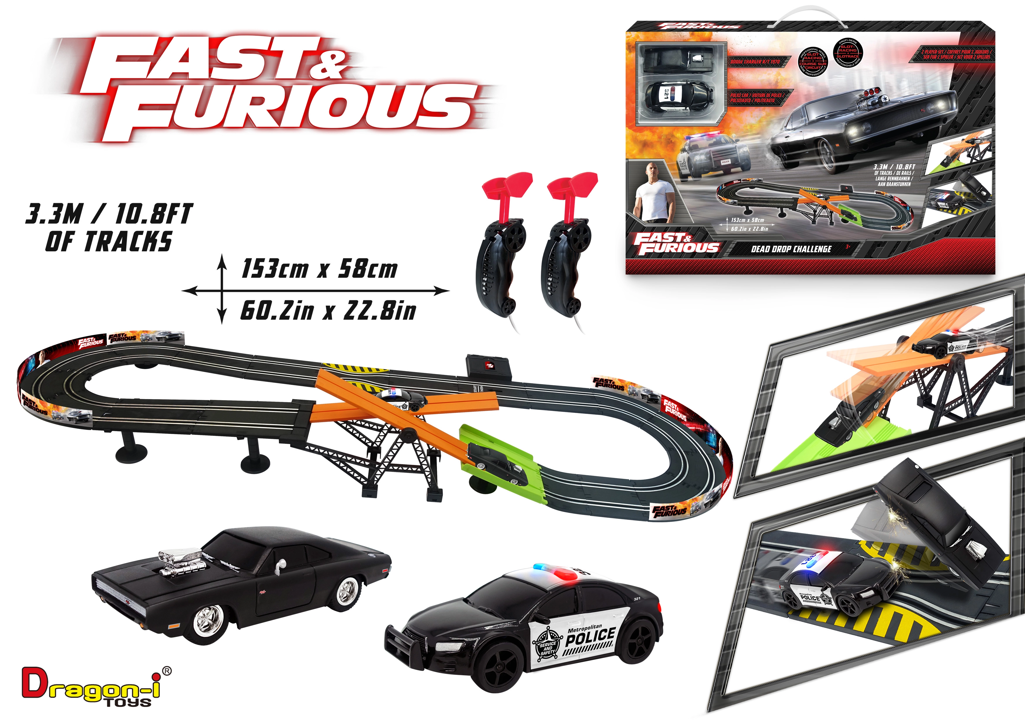 Autobaan met obstakel Fast & Furious. Baans lengte 3,3 m. Afmetingen 153×58 cm. 2 auto’s inbegrepen. 6x AA-batterijen voor het batterijvak niet inbegrepen. Montagehandleiding inbegrepen.