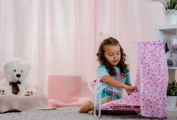 Bijgevoegd zijn een dun dekbedje en een klein kussentje die de pop comfortabel laten uitrusten. Het hemeltje zorgt voor een betoverende look en stimuleert de verbeelding bij het familiespel.