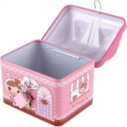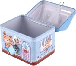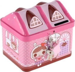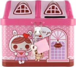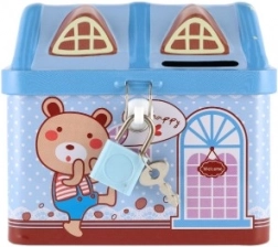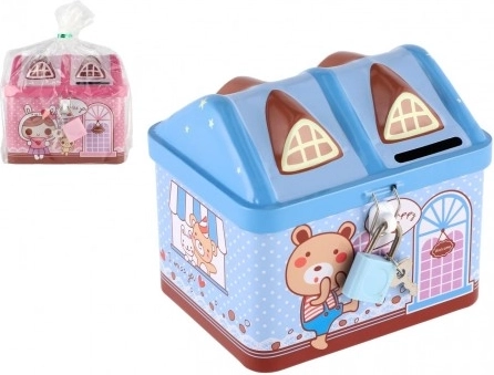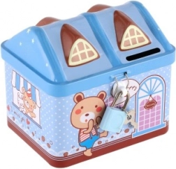 Een schattige blikken spaarpot in de vorm van een huisje leert kinderen slim sparen. Hij heeft een veilig slot met sleuteltje, een praktische gleuf voor muntjes en een duurzame metalen uitvoering in vrolijke kleuren met kinderlijke motieven.