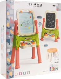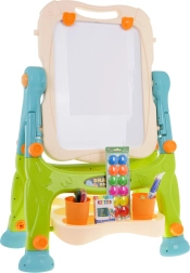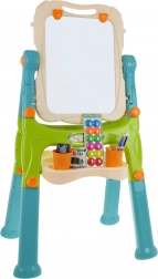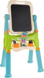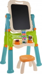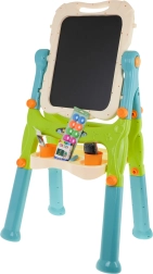 Deze creatieve set combineert een magnetisch wit bord voor schrijven met stiften en het bevestigen van magneten met een zwart krijtoppervlak voor klassiek tekenen. Het bord draait 360°, heeft afgeronde randen voor veilig gebruik en dankzij de uitwisselbare langere en kortere poten pas je het eenvoudig aan de huidige lengte van het kind aan. De praktische plank houdt alle benodigdheden binnen handbereik en geïntegreerde klemmen maken ook tekenen op papier mogelijk.