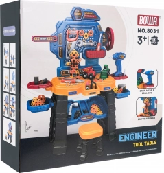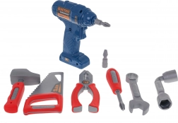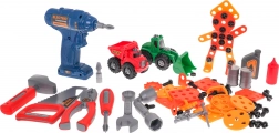 De set bevat een brede selectie gereedschap: boor met bits, zaag, hamer, schroevendraaier, sleutels, tang, tientallen schroeven, pluggen en ringen en tandwielen voor een eerste kennismaking met mechanica. Dankzij het grote aantal onderdelen en vormplaten trainen kinderen geduld, logisch denken en coördinatie.