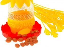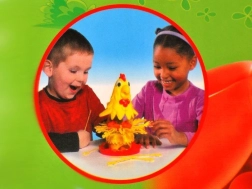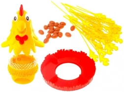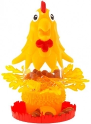 Plaats het nest op de voet, bevestig het transparante kippenlichaam met de kop, steek de veren in de openingen en vul het buikje met eieren. Trek vervolgens voorzichtig de veertjes uit en houd de eieren zo lang mogelijk in het nest. Het spel verloopt met de klok mee en zorgt bij elke beurt voor spanning.