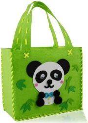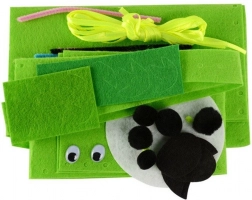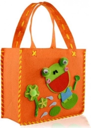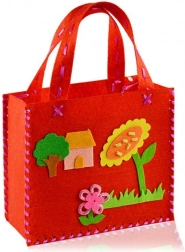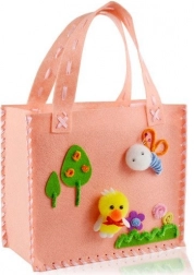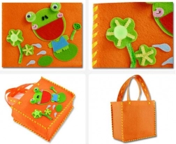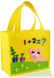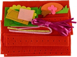 Vooraf uitgesneden viltdelen met gaatjes en een kunststof naald maken het voor kinderen veilig en eenvoudig om het tasje stap voor stap in elkaar te naaien.