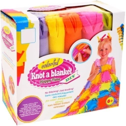 Elk stuk heeft voorbereide franjes – je hoeft de vierkanten alleen maar aan elkaar te knopen en de deken is klaar, zonder naald en draad. Ideaal ook voor beginners.
