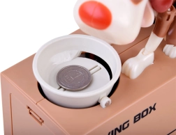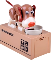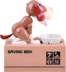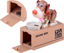 Je gooit een munt in het bakje voor de hond. De hond begint te bewegen alsof hij uit het bakje eet, waardoor de munt in de spaarpot valt. De hond beweegt vrolijk en schudt met zijn oren. Voor gebruik heb je 3 batterijen nodig. De spaarpot helpt kinderen te begrijpen dat sparen niet alleen leuk is, maar ook positieve resultaten oplevert.