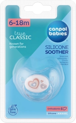 De siliconen fopspeen is gemaakt van transparante siliconen, volledig smaak- en geurloos. De fopspeen is BPA-vrij. In de verpakking 1 stuk.Voordelen van Canpol babies fopspenen: - goede ontluchting; u kunt dit eenvoudig controleren door het speenrubber in te drukken (onderschat dit kenmerk niet: slechte ontluchting kan leiden tot vervorming van het gehemelte en het gebit van het kind); - ventilatieopeningen in het schild zorgen voor luchtcirculatie, voeren speeksel af en voorkomen zo huidirritatie rond de mond; - de ring zit stevig vast, vergemakkelijkt het aanreiken van de fopspeen aan het kind en maakt het mogelijk een speenketting te bevestigen; - verkrijgbaar in diverse aantrekkelijke kleuren. Combineer de fopspeen met een ketting in hetzelfde design.Gebruiksaanwijzing: Steriliseer de fopspeen vóór het eerste gebruik om hygiënische redenen ongeveer 5 minuten in kokend water. Knijp na afkoeling het resterende water uit de speen. Was de fopspeen vóór elk gebruik grondig in warm water. Gebruik geen antibacteriële of chemische reinigingsmiddelen. Overmatig gebruik van reinigers kan kunststof onderdelen beschadigen. Doop de fopspeen nooit in zoete stoffen of medicijnen – dit kan tandglazuurbeschadiging bij het kind veroorzaken. Gebruik een fopspeen maximaal 1–2 maanden en vervang deze daarna om hygiënische en veiligheidsredenen. Als de fopspeen in de mond van het kind verdwijnt, raak niet in paniek – de fopspeen is zo ontworpen dat het kind deze niet kan inslikken en u kunt hem veilig verwijderen. Verwijder de fopspeen zo voorzichtig mogelijk. Bewaar de fopspeen in een schoon, droog en afgesloten etui. Wij raden af de fopspeen te gebruiken voor kinderen ouder dan 3 jaar.Belangrijk! Voor de veiligheid en gezondheid van uw kind! Controleer de fopspeen vóór elk gebruik. Test de kwaliteit van het speenrubber door het in alle richtingen stevig uit te rekken. Bij de eerste tekenen van beschadiging de fopspeen direct weggooien en niet meer gebruiken. Gebruik uitsluitend speenhouders die voldoen aan norm EN12586. Bevestig de fopspeen nooit aan diverse koorden, veters of linten van kleding. Verstikkingsgevaar. Laat de fopspeen niet in direct zonlicht, nabij een warmtebron of langer dan aanbevolen in desinfectiemiddelen liggen – dit kan het speenrubber verzwakken.De siliconen fopspeen voldoet aan: Richtlijn 2001/95/EG van het Europees Parlement en de Raad betreffende algemene productveiligheid, EN 1400-1 Producten voor de verzorging van kinderen – Fopspenen voor zuigelingen en jonge kinderen – Deel 1: Algemene veiligheidseisen en productinformatie, EN 1400-2 Producten voor de verzorging van kinderen – Fopspenen voor zuigelingen en jonge kinderen – Deel 2: Mechanische eisen en beproevingen, EN 1400-3 Producten voor de verzorging van kinderen – Fopspenen voor zuigelingen en jonge kinderen – Deel 3: Chemische eisen en beproevingen.