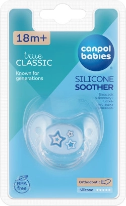 De siliconen speen is gemaakt van transparant siliconen dat volledig smaak- en geurloos is. De fopspeen is BPA-vrij. In de verpakking 1 stuk.Voordelen van Canpol babies fopspenen: - goede ontluchting; u kunt dit eenvoudig controleren door het speendeel in te drukken (onderschat deze eigenschap niet; slechte ontluchting kan leiden tot vervorming van gehemelte en beet van het kind); - ventilatieopeningen in het schild zorgen voor luchtcirculatie, voeren speeksel af en voorkomen zo irritatie van de huid rond de mond; - de ring in de fopspeen zit stevig vast, vergemakkelijkt het aanreiken aan het kind en maakt het bevestigen van een speenketting mogelijk; - verkrijgbaar in diverse aantrekkelijke kleuren. Vul de fopspeen aan met een ketting in hetzelfde design.Gebruiksaanwijzing: Steriliseer de fopspeen vóór het eerste gebruik om hygiënische redenen gedurende ongeveer 5 minuten in kokend water. Druk na afkoelen het resterende water uit de speen. Was de fopspeen vóór elk gebruik grondig in warm water. Gebruik geen antibacteriële of chemische reinigingsmiddelen. Overmatig gebruik van reinigingsmiddelen kan de kunststof onderdelen beschadigen. Dompel de fopspeen nooit onder in zoete substanties of medicijnen – u stelt het kind bloot aan het risico op glazuurbeschadiging. Gebruik de fopspeen maximaal 1–2 maanden en vervang hem daarna om hygiënische en veiligheidsredenen door een nieuwe. Als de fopspeen in de mond van het kind verdwijnt, RAAK NIET IN PANIEK – de fopspeen is zo ontworpen dat het kind hem niet kan inslikken en u hem in dergelijke gevallen veilig kunt verwijderen. Verwijder de fopspeen zo voorzichtig mogelijk. Bewaar de fopspeen in een schoon, droog en afgesloten etui. We raden af de fopspeen te gebruiken voor een kind ouder dan 3 jaar.Belangrijk! Voor de veiligheid en gezondheid van uw kind! Controleer vóór elke keer dat u de fopspeen geeft de staat van de fopspeen. Test de kwaliteit van het speendeel door het in alle richtingen grondig uit te rekken. Bij de eerste tekenen van beschadiging de fopspeen onmiddellijk weggooien en niet verder gebruiken. Gebruik alleen fopspeenhouders die voldoen aan de eisen van norm EN12586. Bevestig de fopspeen nooit aan verschillende koordjes, veters of linten van kleding. Verstikkingsgevaar. Laat de fopspeen niet in direct zonlicht, in de buurt van een warmtebron of in desinfectiemiddelen langer dan aanbevolen – dit kan het speendeel verzwakken.De siliconen fopspeen voldoet aan de eisen van: Richtlijn 2001/95/EG van het Europees Parlement en de Raad inzake algemene productveiligheid, EN 1400-1 Producten voor de verzorging van kinderen – Fopspenen voor zuigelingen en jonge kinderen – Deel 1: Algemene veiligheidseisen en productinformatie, EN 1400-2 Producten voor de verzorging van kinderen – Fopspenen voor zuigelingen en jonge kinderen – Deel 2: Mechanische eisen en beproevingen, EN 1400-3 Producten voor de verzorging van kinderen – Fopspenen voor zuigelingen en jonge kinderen – Deel 3: Chemische eisen en beproevingen.