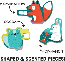 Drie geurende stukjes (marshmallow, cacao, kaneel) en zes gevormde delen maken van het puzzelen een unieke ervaring die zowel de reukzin als de fijne motoriek stimuleert.