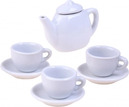 Het gladde witte oppervlak is ideaal om op te schilderen. Afmetingen: kopje hoogte 3 cm, schoteltje diameter 6 cm, theepot met deksel hoogte 6 cm.