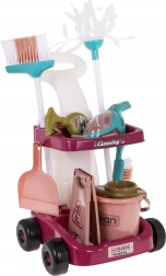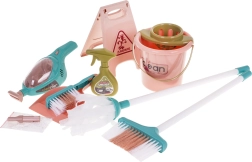 wagen om te monteren, handstofzuiger, emmer met mop, bezem, borstel, blik, stoffer, spray – dummy, waarschuwingsbord, polystyreen bolletjes, verwisselbare opzetstukken voor de stofzuiger (zuigmond en kierenzuiger), vuilniszak, decoratieve stickers