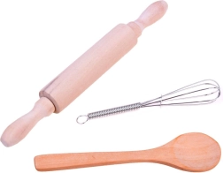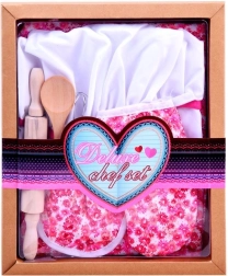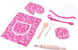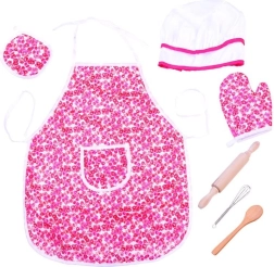 Bevat alle benodigdheden voor de kleine kok: schort, muts, handschoen, onderzetter en keukengereedschap.