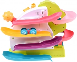 De interactieve 2-in-1 baan valt op door levendige kleuren, schattige figuurtjes en pakkende effecten. In de knikkermodus verplaatst de knikker zich, na het overhalen van de hendel met het leeuwenkopje, naar het hoogste niveau en rolt vervolgens via vier verdiepingen naar beneden, begeleid door vrolijke muziek met de mogelijkheid tot volumeregeling of volledig dempen. In de autootjesmodus laat je het wagentje van boven los en kijk je hoe het razendsnel naar de finish zoeft.