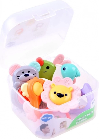 Kleurrijke set bijtringen in de vorm van dieren, ideaal voor de tandjes bij jonge kinderen. De bijtringen zijn licht, makkelijk vast te pakken en helpen de motorische vaardigheden van het kind te ontwikkelen.