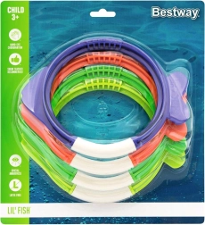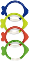 De set duikringen in de vorm van visjes is een leuk en leerzaam hulpmiddel voor in het zwembad. Na het ingooien zinken de visjes langzaam, zodat kinderen kunnen oefenen met oriëntatie onder water, adem inhouden en veilig duiken. Heldere kleuren maken zoeken makkelijker en verhogen de motivatie om te spelen.