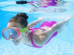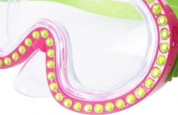 Het duikmasker is versierd met kristallen die het masker een unieke en elegante uitstraling geven, terwijl kinderen genieten van het zwemmen.