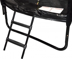 Het springdoek van polypropyleen JUMPING MAT is gestikt met 8 sterke naden, wat de weerstand tegen belasting verhoogt. De geprofileerde metalen palen zijn bedekt met zachte beschermende schuimlaag en de ingang van de trampoline heeft een dubbele bevestiging (rits + gesp). Voor een gemakkelijke instap is er een tweestaps ladder.