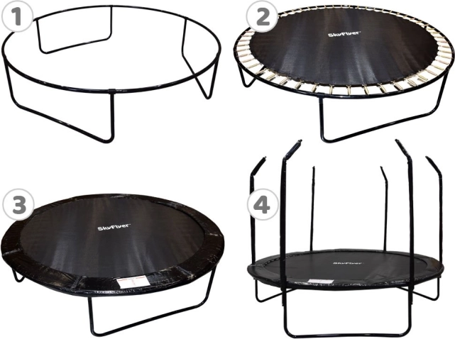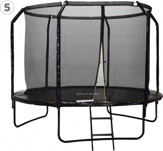 In de doos vind je alles wat je nodig hebt: frame met zwart gelakte buizen, ladder voor comfortabel instappen, verenrand (pad), sterke geoxideerde veren, waterdichte afdekhoes en praktisch toebehoren inclusief een trekhaak voor het spannen van de veren. Dankzij de doordachte constructie (bouten aan de binnenzijde) is de buitenrand glad en veilig.