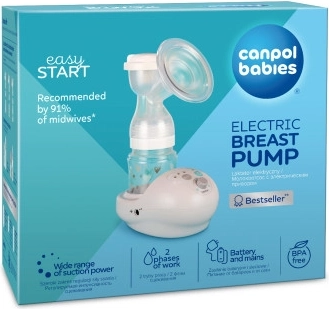 Praktische en stille elektrische borstkolf Canpol babies EasyStart met tweefasig zuigritme, 3 bedrijfsmodi en 3 zuigniveaus ondersteunt de melkproductie op milde wijze en zorgt voor comfortabel kolven op elk moment van de dag en de nacht. Biedt voeding via netstroom en batterijen, een comfortabel siliconen borstschild en is compatibel met alle Canpol babies-flessen. Alles van veilige materialen, BPA-vrij.