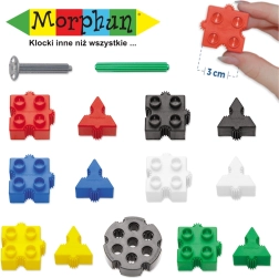 De Morphun Starter-bouwset combineert elementen van klassieke bouwstenen en puzzels – de stukjes kunnen op elkaar gestapeld én zijdelings gekoppeld worden. Met het rijke kleurenpalet en de vormen stimuleert de set natuurlijke nieuwsgierigheid en de ontwikkeling van kinderen. Inclusief wielen voor rijdende modellen en duidelijke stap-voor-staphandleidingen, met sjablonen op schaal 1:1 voor een gemakkelijke start.