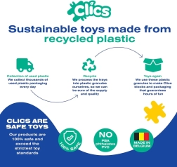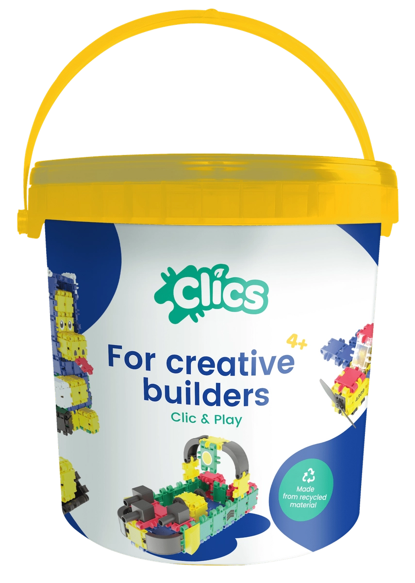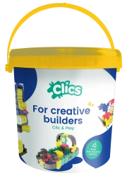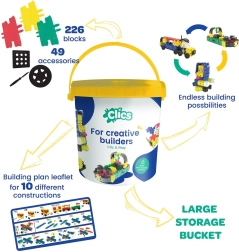 CLICS wordt in België geproduceerd van gecertificeerde materialen en heeft diverse internationale onderscheidingen ontvangen. Dankzij de duurzame uitvoering zijn de modellen functioneel en klaar om mee te spelen – auto’s rijden, propellers draaien en poppetjes bewegen. De emmerverpakking is praktisch voor opbergen en meenemen.