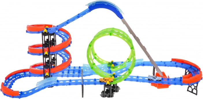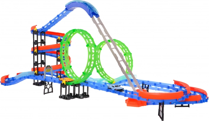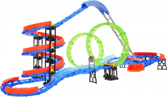 Deze kleurrijke raceset biedt kinderen dynamisch speelplezier met steile opgangen, een dubbele 360°-lus en veiligheidsrailingen in de bochten. Dankzij fluorescerende elementen licht de baan op in het donker en wordt het racen nog leuker. Twee lichte raceautootjes met LED-verlichting worden aangedreven door een ingebouwde 3,7 V-accu en laden op via USB.