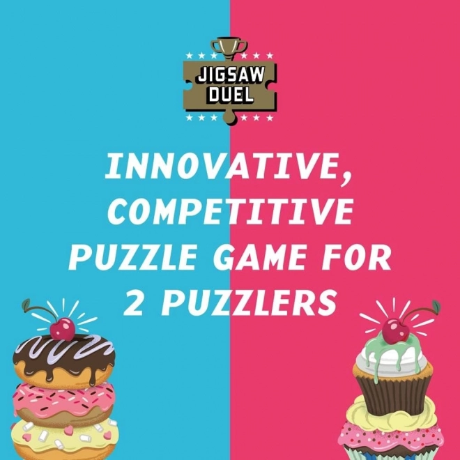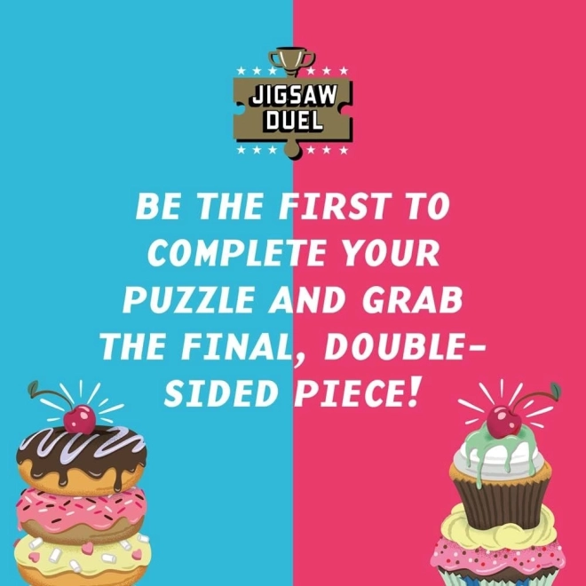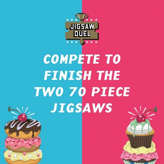 Geniet van een spannende puzzeluitdaging voor twee met Puzzle Duel Zoete Afrekening: donut vs cupcake. Twee minipuzzels van elk 70 stukjes, een race om het laatste gezamenlijke stukje en kleurrijke voorbeelden in de verpakking garanderen plezier voor koppels, vrienden en families.
