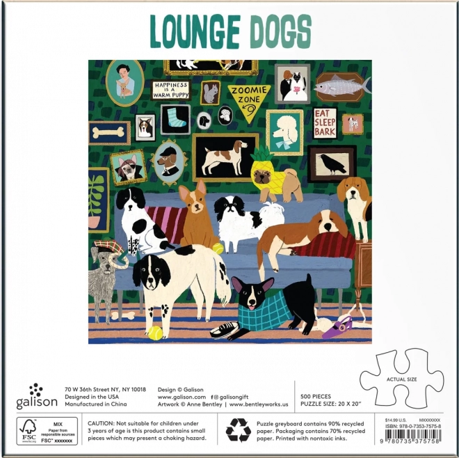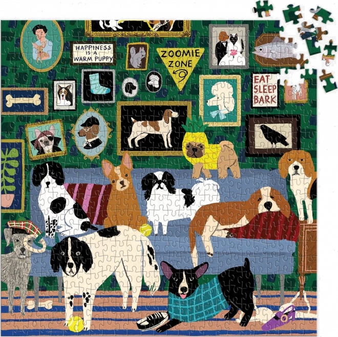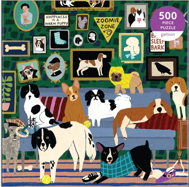 Geniet van ontspanning met een elegante puzzel met honden in een knusse salon. Deze vierkante set biedt 500 stukjes, hoogwaardige druk en een voorbeeld van het motief voor makkelijker leggen. Na het leggen ontstaat een afbeelding van ca. 51 × 51 cm – ideaal om in te lijsten.