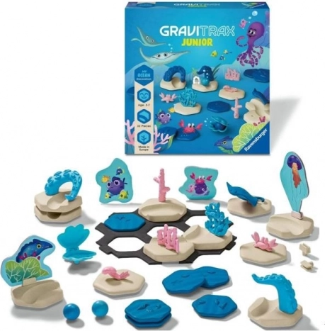 Breid je GraviTrax Junior-baan uit met een magische onderwaterwereld! De set Oceaan brengt decoraties en diertjes uit de diepte van de zee, die elke knikkerbaan in een thematisch avontuur veranderen. Ideaal voor kinderen vanaf 3 jaar, ondersteunt creativiteit, logisch denken en biedt veel bouwplezier. Onderdelen zijn gemaakt van houten bioplastic.