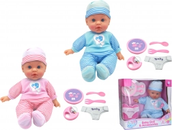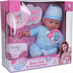 In de verpakking vind je alles voor de eerste zorg: een bordje met vork en lepeltje, een rammelaar en een luier. Het speelgoed bevordert de ontwikkeling van de fijne motoriek, empathie en verantwoordelijkheid. Er zijn twee elegante kleuruitvoeringen – roze en blauw.