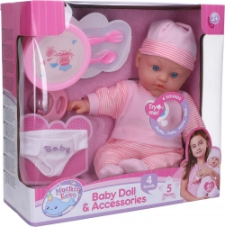Deze charmante babypop is een geweldige metgezel voor fantasierijke rollenspellen. Dankzij het zachte lijfje is het heerlijk om mee te knuffelen, en bij het indrukken van het buikje verrast het kind met babygeluiden, die de verbeelding prikkelen en de communicatie stimuleren.