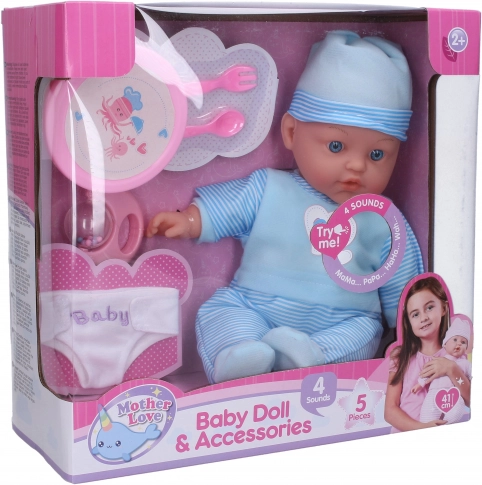 Een schattige baby met geluiden van 41 cm maakt elke kleine verzorger blij. Het heeft een zacht lijfje en maakt bij het indrukken van het buikje realistische geluiden (mama, papa, lachen, gebrabbel). Inclusief praktische accessoires om mee te spelen. Verkrijgbaar in 2 kleurvarianten – roze en blauw.