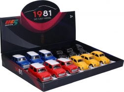 Metalen autootje van 11 cm met terugtrekmechanisme en openslaande deuren. Leverbaar in een verpakking van 12 stuks met 6 verschillende varianten, ideaal voor kleine verzamelaars.