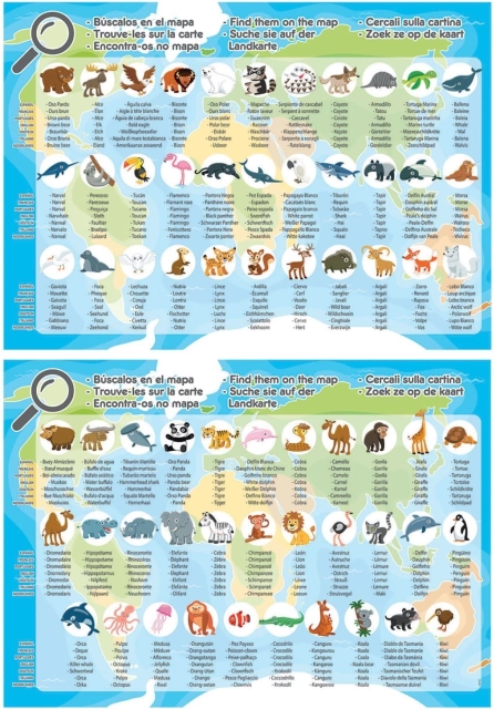 Geografische puzzel voor kinderen met illustraties van dieren van over de hele wereld. Op de puzzel vind je bijvoorbeeld pinguïns, kamelen en bizons. De namen van de continenten en oceanen zijn in het Engels. De verpakking bevat ook een informatieve folder met de namen van alle dieren (in het Spaans, Frans, Portugees, Engels, Duits, Italiaans en Nederlands). Zodra de puzzel is gelegd, kun je een zoekspel spelen met de afbeeldingen. Wie vindt ze allemaal? Afmeting van de gelegde puzzel ca. 48 x 34 cm