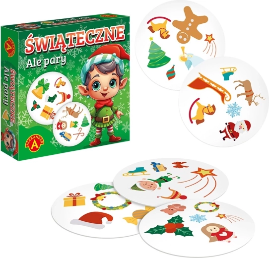 ALE PARY – Świąteczne is een snel en eenvoudig kaartspel waarin degene met het beste observatievermogen wint. In de doos vind je een set van 31 kaarten met 6 afbeeldingen in een kerstsfeer. Elke twee kaarten hebben altijd precies één gezamenlijke afbeelding, maar om het niet te gemakkelijk te maken, verschillen de afbeeldingen vaak in grootte. Het spel draait om het zo snel mogelijk vinden van de gemeenschappelijke afbeelding. Afhankelijk van de spelvariant wint degene die de meeste kaarten verzamelt of het snelst al zijn kaarten kwijtraakt. Het spel is een goede training voor visuele analyse en het vermogen om details te zien en te onderscheiden.