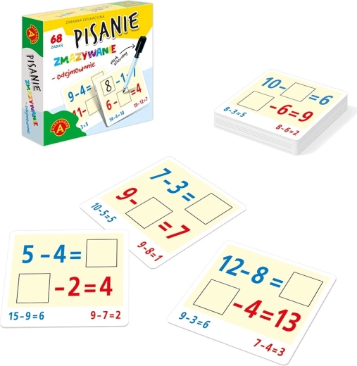 Het schrijfpakket aftrekken - aftrekken is bedoeld voor kinderen die beginnen met het leren van wiskunde. Op de kaarten van de set staan 68 aftrekoefeningen. De onbekende kan een van de 3 getallen in de opgave zijn. De bewerkingen worden uitgevoerd met getallen van 1 tot 20. De onbekenden in de opgaven worden met een uitwisbare pen geschreven, wat hergebruik van de kaarten mogelijk maakt. Het speelgoed is een geweldige stimulans om rekensommen te onthouden en om zelfstandig naar oplossingen te zoeken, waardoor natuurlijke vaardigheden worden ontwikkeld. Elk genoteerd resultaat kan worden gecontroleerd met de oplossing op de achterkant van de kaart. Het praktische formaat van de verpakking maakt het mogelijk om het speelgoed letterlijk overal mee naartoe te nemen.