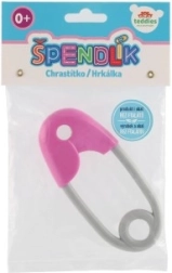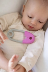 De rammelaar in de vorm van een speld is een onmisbaar onderdeel van de uitzet van ieder kind. Hij is zo ontworpen dat hij gemakkelijk vast te pakken is door kleine handjes en dankzij het lichte gewicht de kinderhanden niet belast. De roze-grijze contrasterende kleuren spreken aan en ondersteunen de visuele waarneming. Kinderen zullen genieten van het zachte gerammel bij elke beweging.