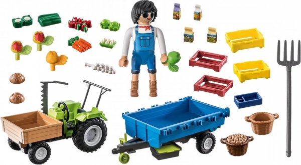 De boerfiguur, aanhanger, kistjes, fruit, groenten en gereedschap vergroten de speelmogelijkheden en stimuleren de fijne motoriek.