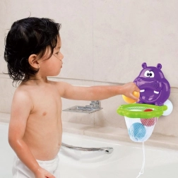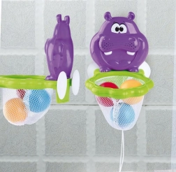 Bad speeltje Nijlpaardje is een favoriet speeltje voor kleine kinderen dat hun vaardigheid en motoriek ontwikkelt. Dankzij de zuignappen is het gemakkelijk aan het bad te bevestigen en kan het kind plezier hebben bij het gooien van gekleurde ballen in het nijlpaardje.