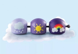 De componenten hebben afgeronde vormen en een formaat dat ideaal is voor kleine handen. Het spel ondersteunt fijne motoriek (inzetten, schuiven, verbinden en loskoppelen van onderdelen), taalvaardigheden (het benoemen van zon, regen, regenboog) en creatief denken dankzij de diverse bouwcombinaties.