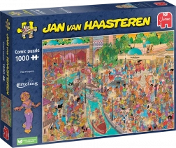 Geniet van uren puzzelplezier met de hoogwaardige JUMBO-legpuzzels uit de reeks van Jan van Haasteren. De illustratie “Efteling Fata Morgana” zit vol typische humor, talloze kleine scènes en verborgen motieven zoals een haaienvin, zwervende handen en een portret van Haasteren. Met 1000 stukjes en een kleurrijke, gedetailleerde tekening is het leggen boeiend voor het hele gezin.