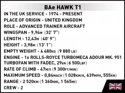 COBI Armed Forces BAe Hawk T1 is een bouwset waarmee je een model kunt construeren van het vliegtuig dat sinds 1976 dienstdoet bij de Royal Air Force (RAF). Deze set is ideaal voor alle liefhebbers van modelbouw en militaire techniek. Het model is ontworpen op schaal 1:48 en bevat 362 elementen, die samen vleugels vormen met een spanwijdte van 19,5 cm. Het model heeft een te openen cockpit en afneembare wielen voor een effectvolle presentatie op een standaard.