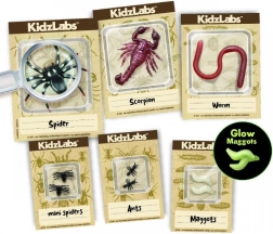 Het gipsblok verbergt realistische figuurtjes van spinnen, wormen en mieren. Kinderen onthullen ze stap voor stap met de meegeleverde beitel en het kwastje.