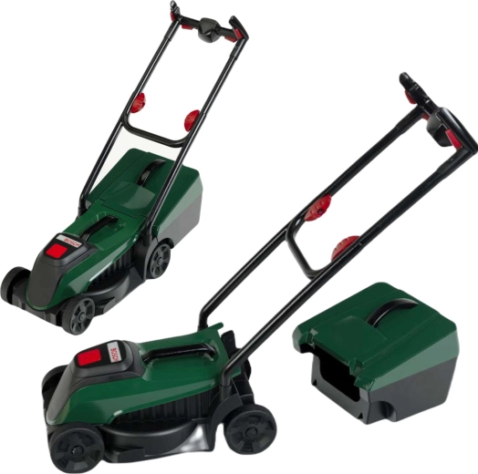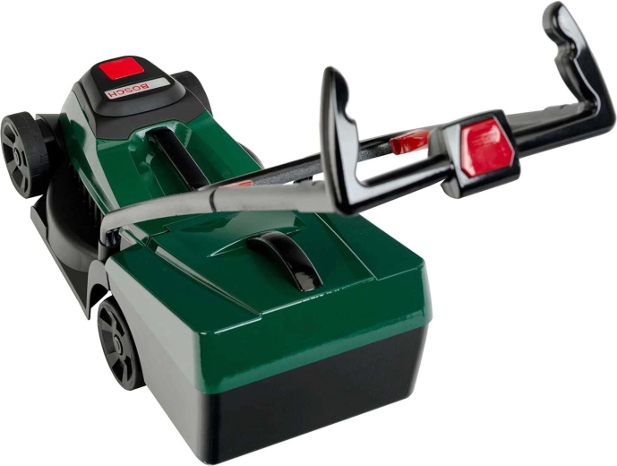 Deze kinderspeelgoed grasmaaier bootst een echte machine overtuigend na: een donkergroene behuizing, zwarte beugel en bewegende wielen die soepel rollen over diverse ondergronden. De geïntegreerde, uitneembare licht- en geluidsmodule laat na een druk op de knop het BOSCH-logo oplichten en speelt realistische motorgeluiden af. Ook zonder module hoor je tijdens het duwen een prettig mechanisch “klikken” en het ritmische gerommel van de wielen.