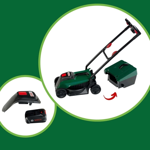 Realistische kinderspeelgoed grasmaaier in donkergroen met een Bosch licht- en geluidsmodule die kleine tuiniers zal verrassen. Na het indrukken van de knop licht het BOSCH-logo op en hoor je authentieke motor- en maai-geluiden. Dankzij het lage gewicht, de afneembare opvangbak en de bewegende wielen is hij ideaal om mee te spelen, zowel binnen als buiten.