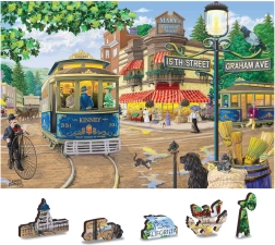 Deze premium houten puzzel toont een levendige scène met een retrotram en een straat vol details uit die tijd. Dankzij laser-gesneden stukjes met gladde randen is het leggen zowel een plezier als een uitdaging. De dubbelzijdige uitvoering maakt het mogelijk te leggen aan de voorzijde volgens het motief of aan de achterzijde volgens een herhalend patroon.