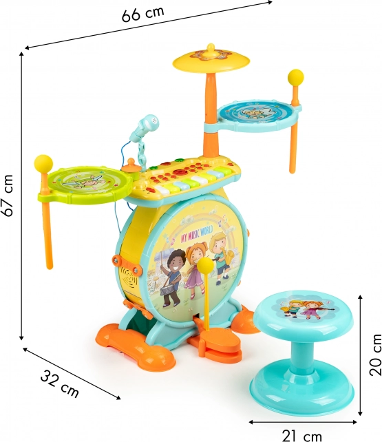 Laat uw kinderen zich onderdompelen in de wereld van melodieën en eigen liedjes componeren met deze geweldige muziekset. Het kinder drumstel ziet eruit als een echt muziekinstrument en is voorzien van een krukje voor comfortabel spelen. Kinderen zullen enthousiast zijn over de mogelijkheden die deze set biedt, inclusief karaoke en aansluiting op telefoon of mp3-speler.