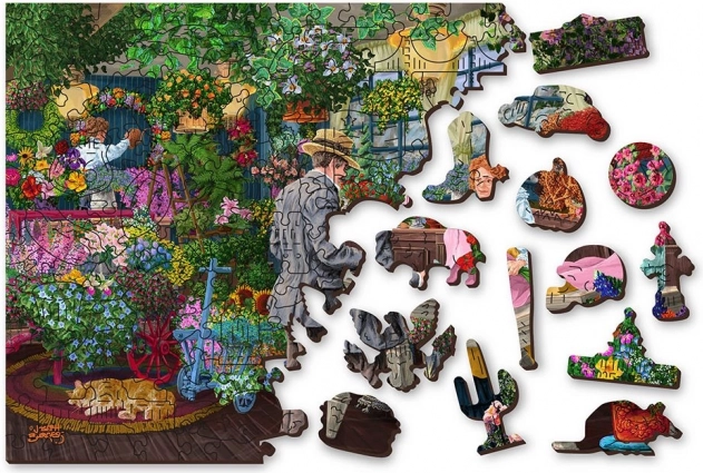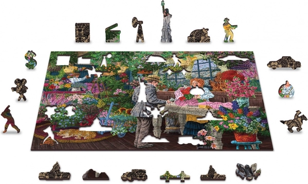 Stijlvolle houten puzzel met het motief van een levendige bloemisterij voor liefhebbers van gedetailleerde illustraties en uitdagender puzzels. Dankzij het dubbelzijdige ontwerp geniet je van twee puzzels in één – de voorkant met een kleurrijke scène vol bloemen en de achterkant met een patroon om op vorm te leggen. Unieke uitsparingen in de vorm van dieren, personages en voorwerpen werken als kleine figuurtjes en geven het puzzelen een nieuwe dimensie.
