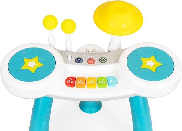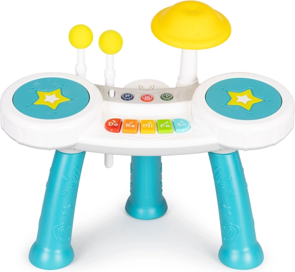 Bijgeleverd zijn twee drumstokken met zachte uiteinden, waarmee kinderen kunnen spelen als op echte drums: sla eenvoudig op de drums of de bekkens en hoor het geluid. De speelgoedset biedt veel muzikale modi en voorgeprogrammeerde melodieën, wat zorgt voor eindeloos plezier en het stimuleren van creativiteit.